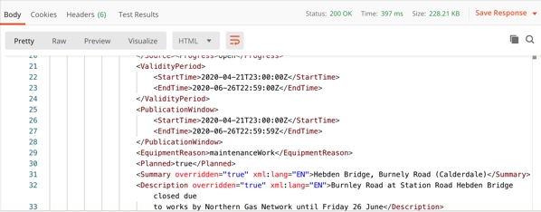 Once you have issued a valid request you will get a response in XML with details of the all the Situations that are currently available.