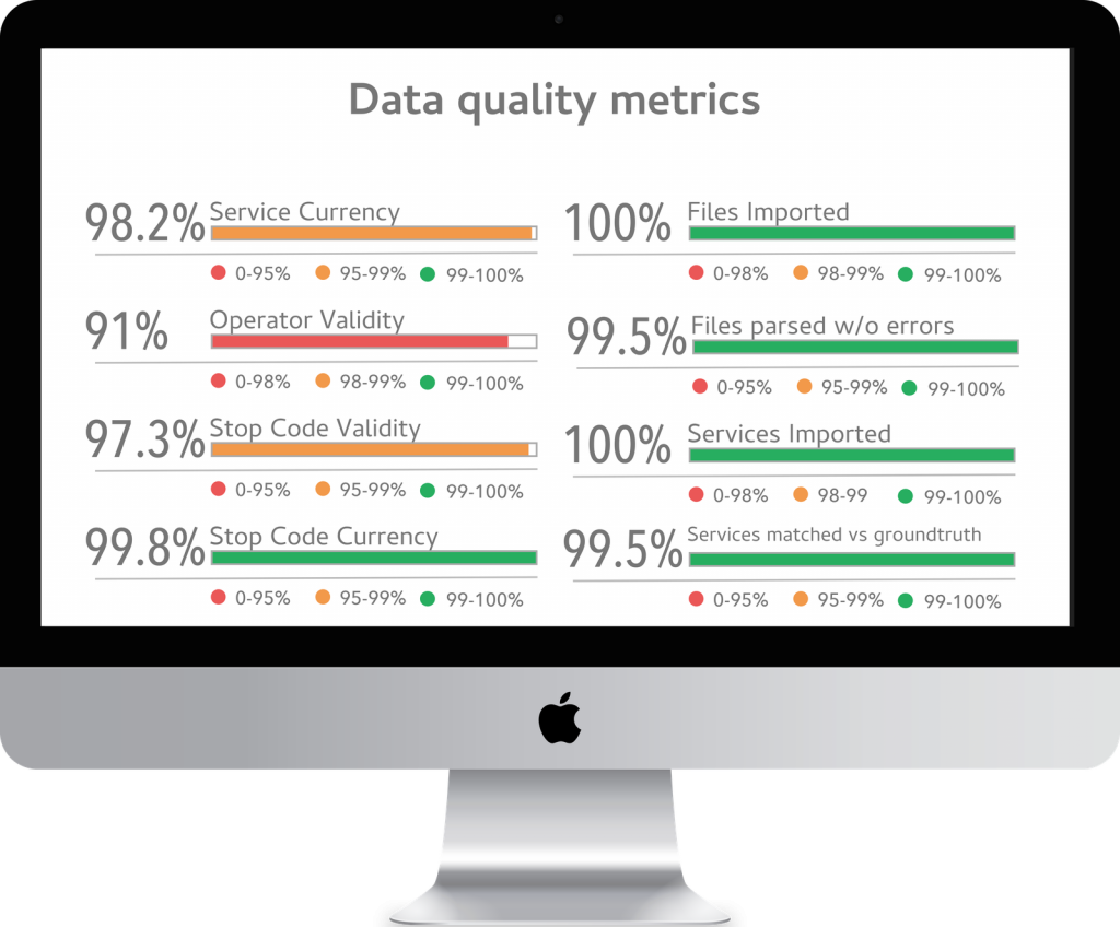 We use this framework to define metrics, and compare their values to thresholds set to identify problematic data. If any one transport operator is missing from a dataset, this could be a big problem. By defining a Missing Operator metric, with a threshold of 0%, we can account for this scenario. For stale data we might choose to be more forgiving: with bus schedules there is often some data in the past. For example school services only run in term time, but often still linger in the dataset into the start of the Summer holidays. A Service Currency metric – with threshold set to 98% – can allow us to account for this baseline, whilst catching more issues such as an entire operator submitting stale data.