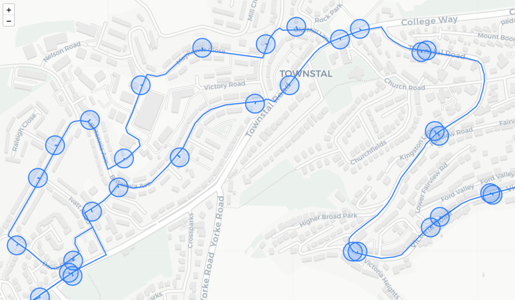 The most obvious use for bus route geometry is to show the route over a map. Either as an overview of the entire service, or as a backdrop for the live bus locations. The bus route geometry is also used in more subtle ways in the background. It is essential for tracking a buses progress through its scheduled journey, and accurately calculating not only which bus stops it is between, but its progress between them. This allows “ladder” views of bus journeys that accurately portray how far between stops a bus is, and is also crucial for prediction engines to calculate estimated arrival and departure times.