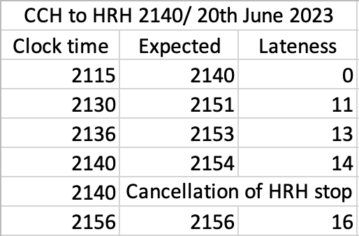At the moment the Historical Service Performance API available from RDG and dating back to 2016 only allows you to retrieve the actual times run by the train at the end of the service. The picture below left in black shows the sum total of the data available for the 21:40 train we were trying to catch at Chichester (CCH). The only way you can tell that the final stop was cancelled is by the absence of an actual time at Horsham (HRH), reason 574 can be either a delay or a cancellation and it only gives the ‘RID’ code to identify the train, so this is not very comprehensive.