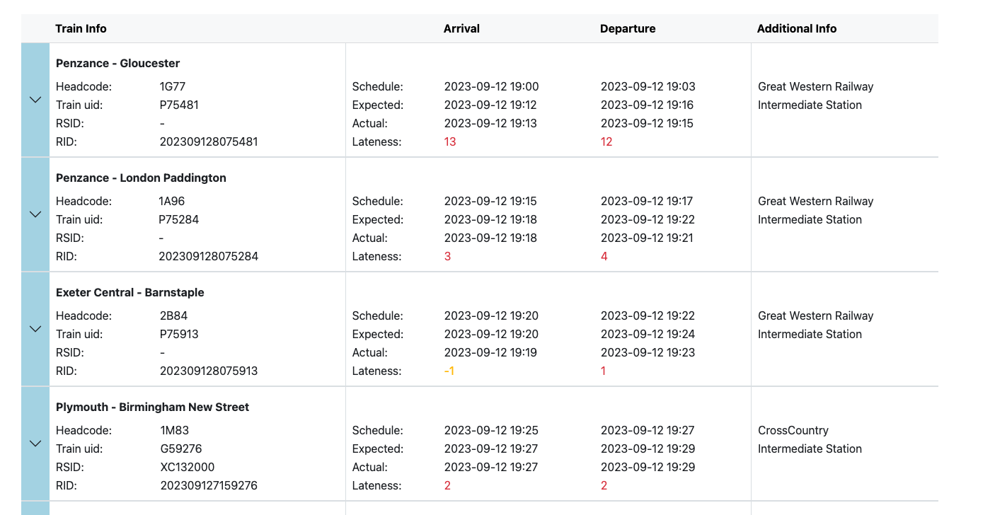The example above shows how to query the journeys that arrived, or departed Exeter St David’s between 19:15 and 21:15 on 12 Sep 2023. The time of interest controls your time travel – by setting it to 20:15 you’ll see the actual times that had been recorded up to that point, and the expected times that were predicted for services that hadn’t yet arrived or departed. Shifting the time of interest allows you to time travel to see that status either further ahead, or back in time.