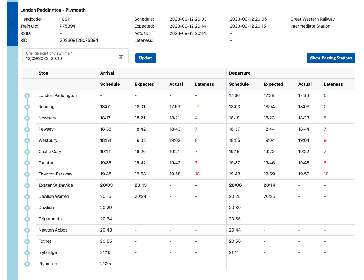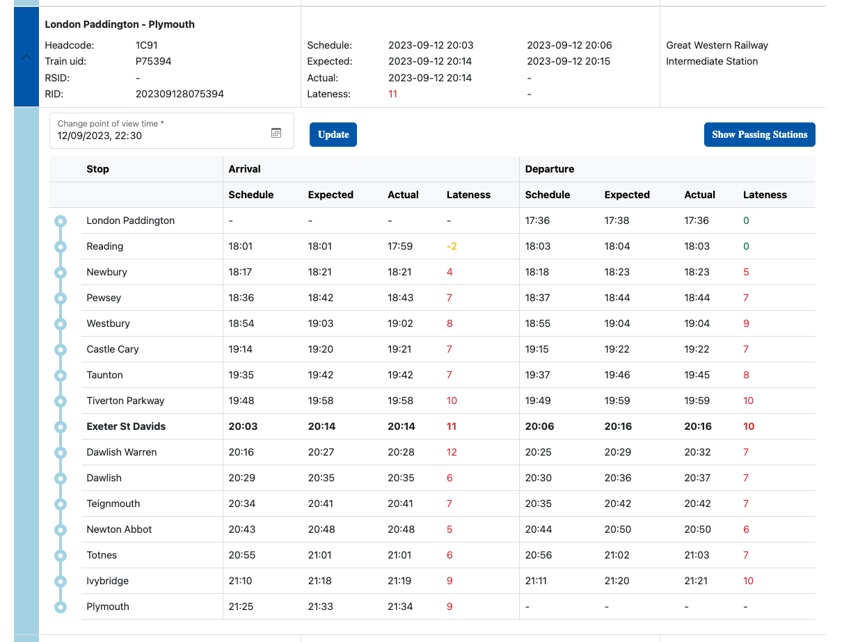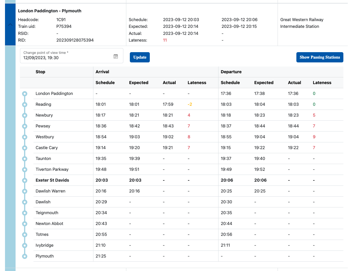 You can drill down to a particular journey, and apply the same time shift approach to see how expected times vary as the journey progressed. At 19:30 the Paddington-Plymouth train was expected to depart Exeter St Davids at 20:06.