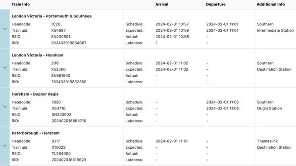 National Rail Darwin system assigns a distinct RID to each separate run of a service on each day by adding the date to the TRAIN_UID… and this is the only reference that uniquely identifies the London Victoria (VIC) to Horsham (HRH) scheduled to arrive at 11.02 on 1st February 2024