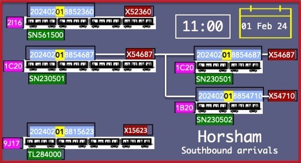 If you put these references together across a service pattern you get a picture of how trains can be differentiated from each other. In the graphic below we see all three southbound arriving services at Horsham on 1st February 2024 between 11am and noon: